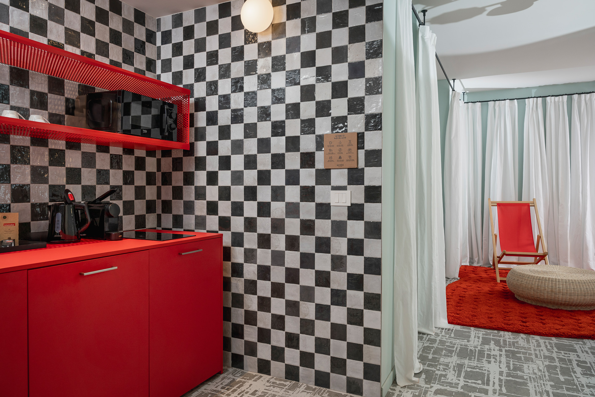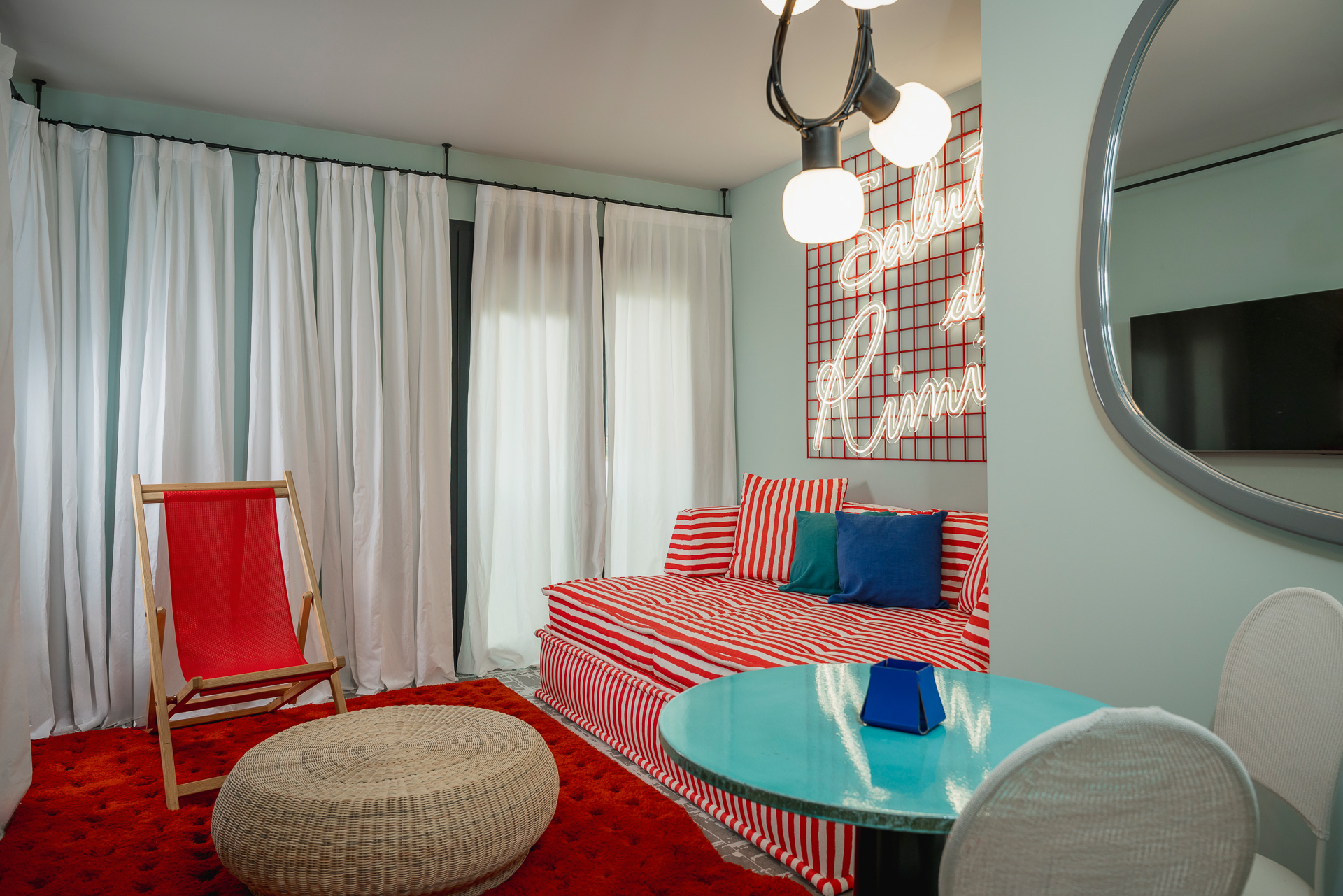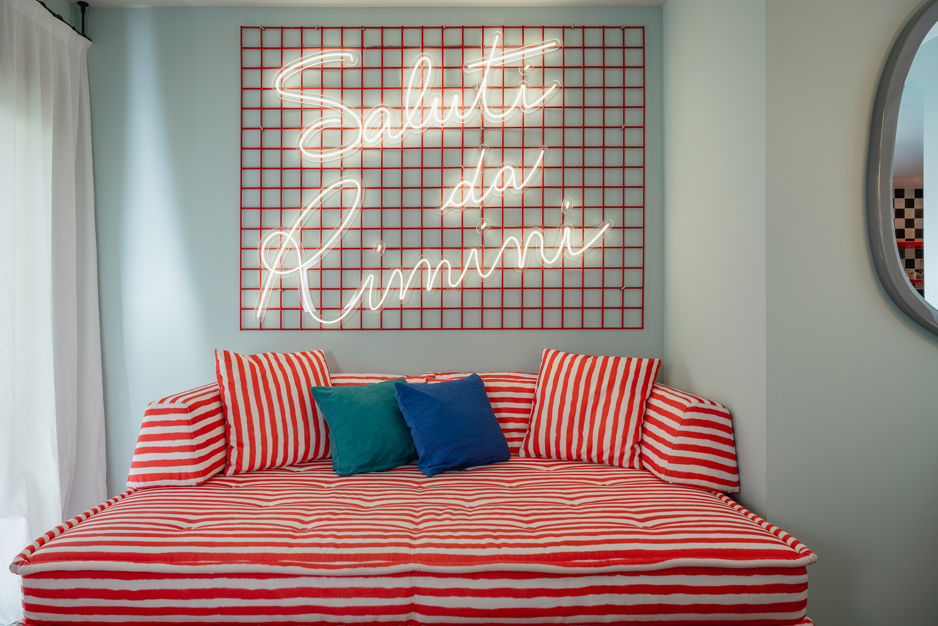 La suite Estate Italiana racconta quel modo spensierato di vivere la vacanza estiva in riviera, un omaggio up to date all’unicità dell’accoglienza riminese, con un chiaro riferimento alle cartoline che venivano spedite dalle vacanze, ripresa nella testata del letto.