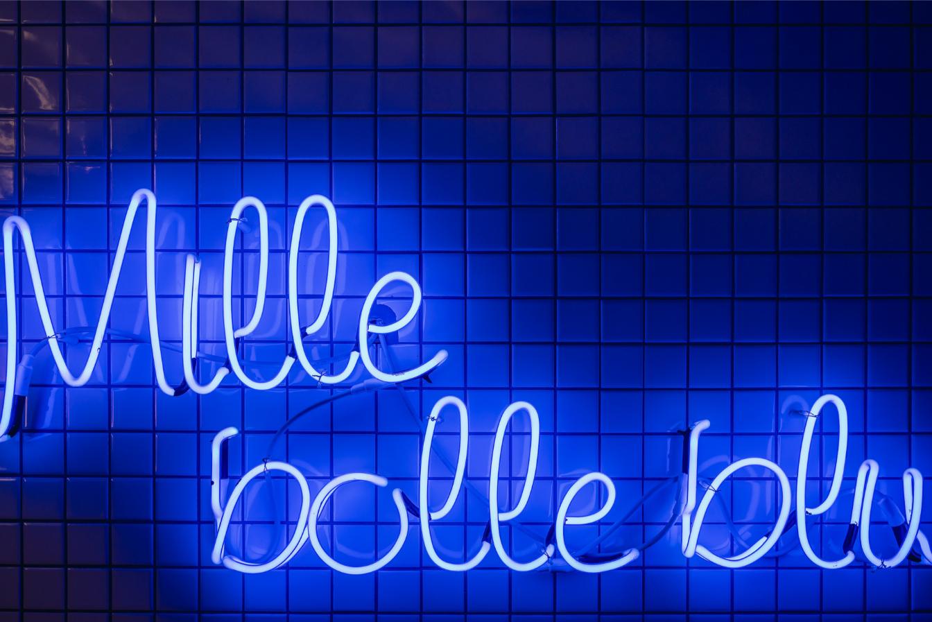 Progetto nel progetto è Mille bolle blu, la lavanderia a disposizione degli ospiti, dove una scritta al neon, “Mille bolle blu”, illumina in un gioco di riflessi un soffitto in alluminio (facilmente smaltibile e riciclabile) che riproduce un effetto acqua.