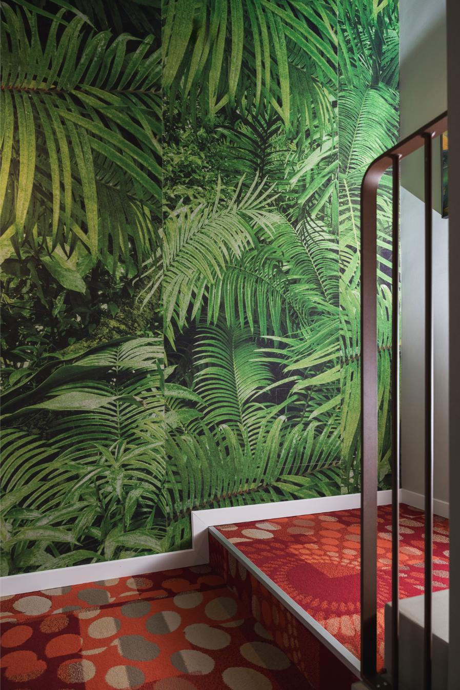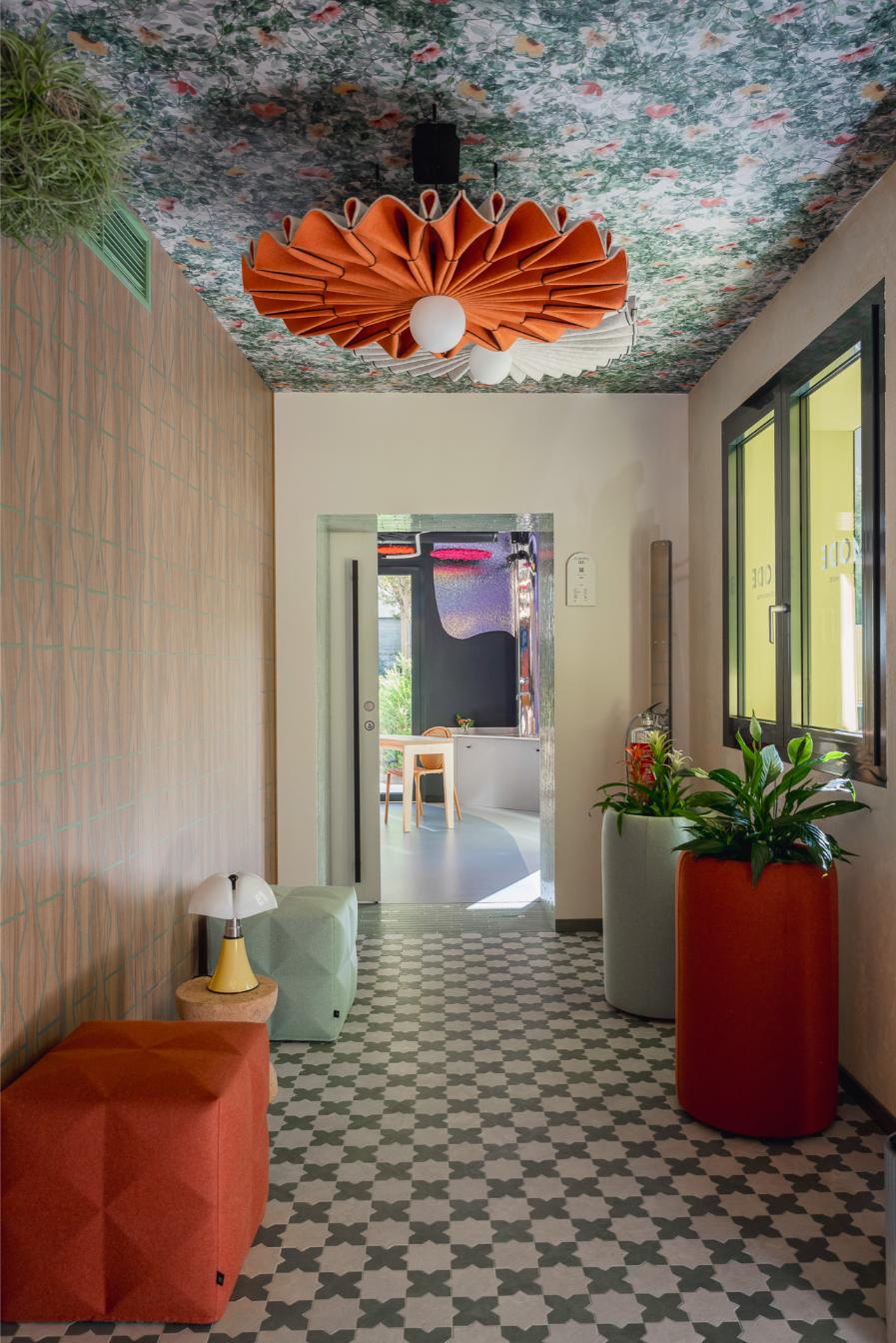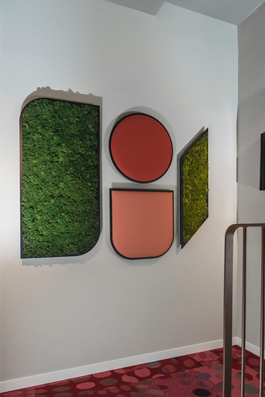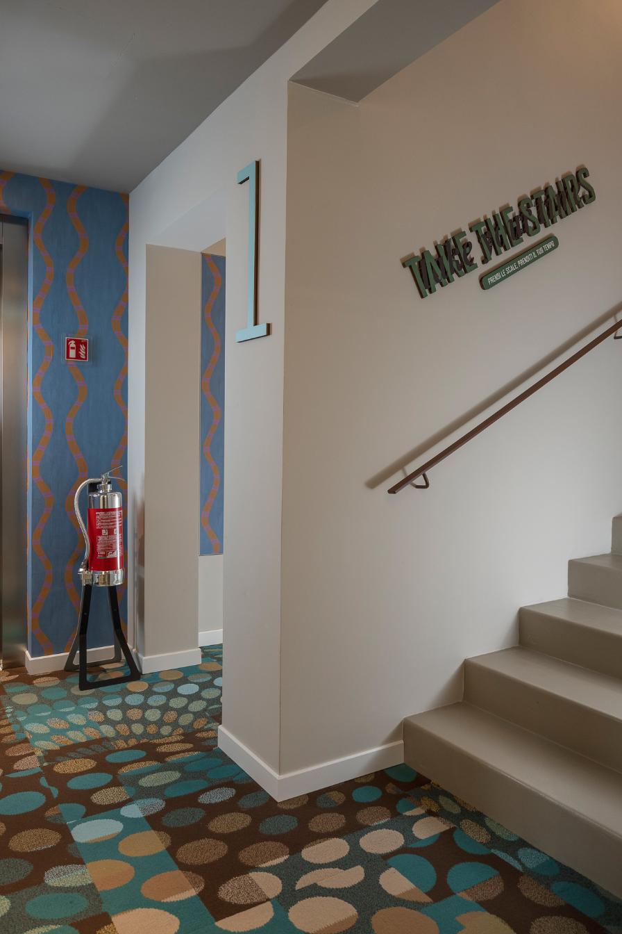 L’ingresso al piano terra, le scale e i servizi al piano terra sono studiati da Laura Verdi. Il titolo del progetto “Stai cosy in una second life”. “È un gioco di parole tra italiano e inglese che significa: trovati a proprio agio in una seconda vita, recupera e riutilizza il più possibile, non sprecare le risorse attuali”. Un progetto di sostenibilità che si traduce non solo nel riciclo e riutilizzo di materiali (come per esempio la plastica proveniente dalla pulizia degli Oceani utilizzata per la realizzazione delle moquette o i corpi lampade fonoassorbenti fatte in feltro realizzato con bottiglie di plastica PET) ma anche una sostenibilità estesa al benessere della persona, amplificando il concetto di rapporto tra uomo-natura con l’utilizzo di disegni biogeometrici e floreali e inserendo elementi di verde come le piante di tillandsia, che si nutrono dell’umidità presente nell’aria e la purificano eliminando gli agenti inquinanti.